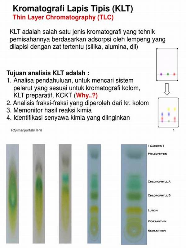 Kini mari kita masuk lebih dalam ke dalam dunia kromatografi TLC. Teknik ini melibatkan penggunaan plate (dalam bentuk kaca, aluminium, atau plastik) yang dilapisi dengan lapisan tipis adsorben seperti silica gel. Substansi yang akan dianalisis diterapkan pada titik asal dari plate tersebut. Kemudian, plate tersebut ditempatkan secara vertikal dalam wadah yang mengandung pelarut. Ketika pelarut naik melalui kapilaritas, ia membawa komponen campuran dengan kecepatan berbeda tergantung pada afinitas masing-masing komponen terhadap adsorben dan pelarut. Hasil akhirnya adalah pemisahan visual berupa noda-noda yang bisa dianalisis lebih lanjut.