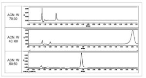 Kromatogram HPLC-UV representatif dari 100 μg/mL asam α-lipoat dalam tiga fase bergerak berbeda yang mengandung asetonitril (ACN) dan air (W), semuanya dengan pH = 4,0. Puncak depan adalah PBS, asam asetat, dan CD, dan tidak ada satu pun yang mengganggu puncak ALA.