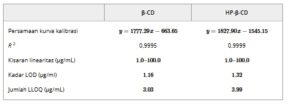 TABEL 1. Data dari kurva regresi untuk ALA dalam dua siklodekstrin yang dievaluasi, β-siklodekstrin (β-CD) dan HP-β-siklodekstrin (HP-β-CD). Data ini mencakup persamaan kurva kalibrasi, koefisien determinasi ( R 2 ), rentang linearitas, batas bawah deteksi (LLOD) dan batas bawah kuantifikasi (LLOQ).
