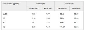 Hasil akurasi dan presisi ALA dalam metode β-CD ditunjukkan pada Tabel 2. Tidak ada perbedaan signifikan secara statistik dalam akurasi antara intraday dan interday, meskipun semakin tinggi konsentrasi, semakin presisi konsentrasinya. Ada juga perbedaan signifikan antara presisi intraday dan interday untuk konsentrasi 50 dan 75 μg/mL. Namun, presisi dan akurasi berada dalam kisaran 15% dari nilai konsentrasi aktual, yang dinyatakan dalam pedoman ICH.