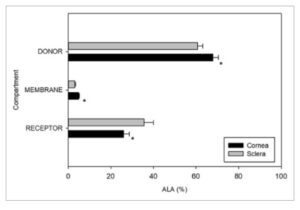 Keseimbangan massa ALA (%) dari tiga kompartemen: donor, membran dan reseptor setelah 3 jam kornea dan sklera ( n = 6, mean ± SD). Perbedaan signifikan antara kedua jaringan ditandai dengan *.