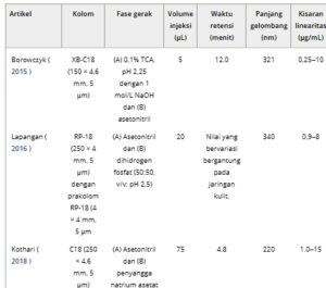 TABEL 3. Ringkasan berbagai metode HPLC-UV untuk deteksi ALA. Metode kami ditetapkan dengan mengoptimalkan parameter berikut: kolom, fase gerak, volume injeksi, waktu retensi, panjang gelombang deteksi, rentang linearitas, LLOD dan LLOQ.