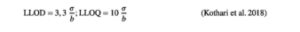 Kurva kalibrasi ALA disiapkan dari sampel biologis kosong dan tujuh tingkat konsentrasi (dari 1 hingga 100 μg/mL). Kurva kalibrasi dilaporkan dalam bentuk garis regresi linier, dengan kemiringan dan intersep. Dari data yang diperoleh dari lima kurva kalibrasi selama 3 hari, LLOD dan LLOQ dihitung melalui rumus berikut: