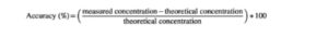Ketepatan dan presisi dinilai melalui eksperimen dalam-hari dan antar-hari, menggunakan empat tingkat konsentrasi: LLOQ, konsentrasi rendah (10 μg/mL), konsentrasi sedang (50 μg/mL) dan konsentrasi tinggi (75 μg/mL). Untuk ketepatan dalam-hari, enam kali ulangan dari setiap tingkat konsentrasi dievaluasi dalam satu hari. Ketepatan antar-hari dilakukan dengan mengevaluasi dua kali ulangan dari setiap tingkat konsentrasi setiap hari selama 5 hari. Ketepatan ditentukan dengan menilai konsentrasi ALA tertentu dan menghitung deviasi relatif di lima garis kalibrasi. Ketepatan dinyatakan sebagai persentase deviasi dari konsentrasi nominal, menggunakan rumus berikut: